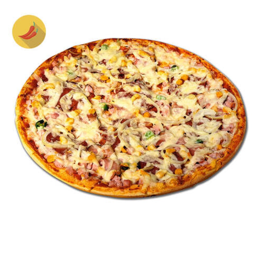 kukuřice, feferony, slanina, eidam, suchý salám, cibule, šunka, oregano, tomat